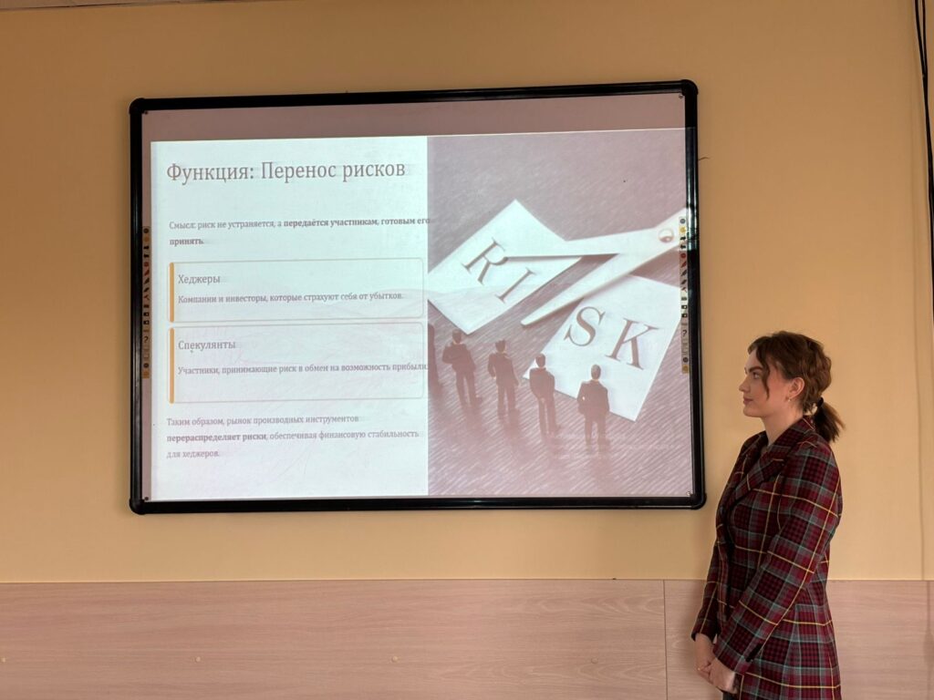 Владимирова Е. и Яцко А. представили презентацию «Риск события: хеджирование», разъяснив принципы компенсации, переноса рисков и использование производных финансовых инструментов — фьючерсов, форвардов и опционов — для защиты от резких колебаний рынка.