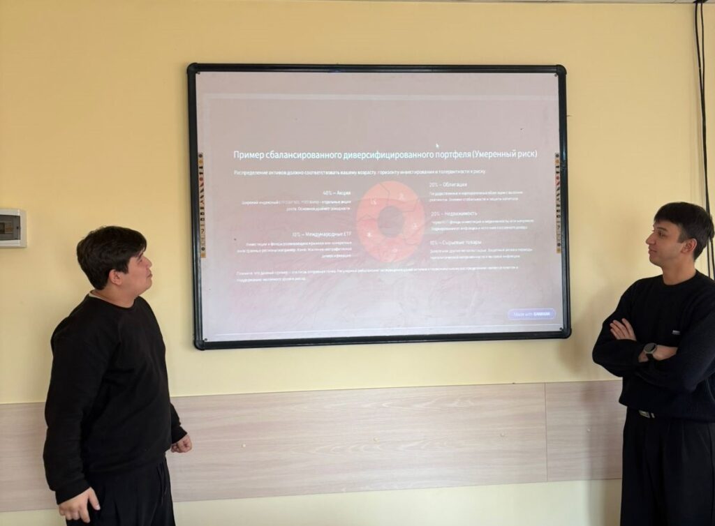 Молдабай М. и Ринатулы А. выступили с темой «Рыночный риск: диверсификация», отметив важность разнообразия активов, географической и отраслевой диверсификации для снижения рисков и устойчивого развития инвестиционного портфеля.