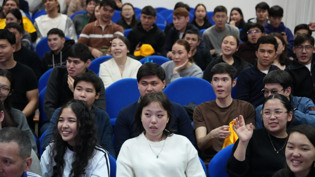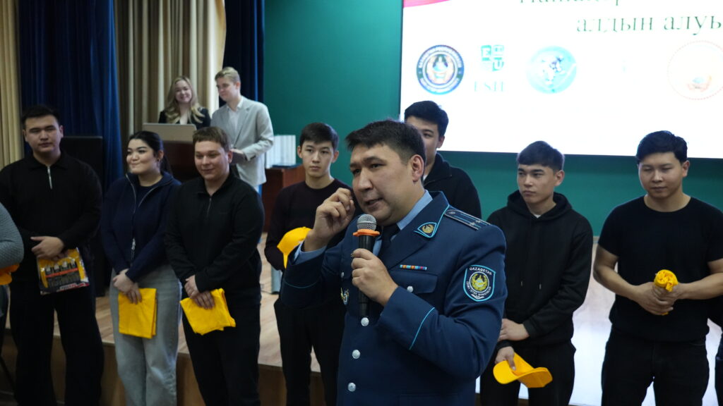 Сотрудник УПН ДП г. Астана, подполковник полиции Дамир Байбазаров, представил деятельность подразделения, после чего провёл интерактивную сессию со студентами, направленную на повышение осведомленности о профилактике правонарушений.