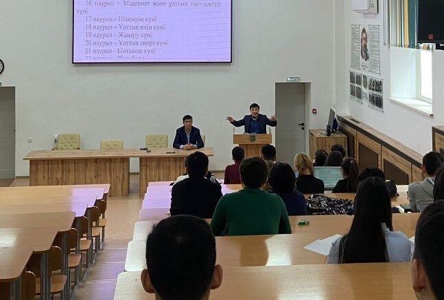Преподаватели кафедры «Право» к.ю.н., и.о. доцента Кемельбеков С.Т., ст.преподаватель Х. Маней для студентов 2-го курса, обучающихся по специальностям «Право» провели кураторский час «Преемственность поколений – Наурыз символ единства».